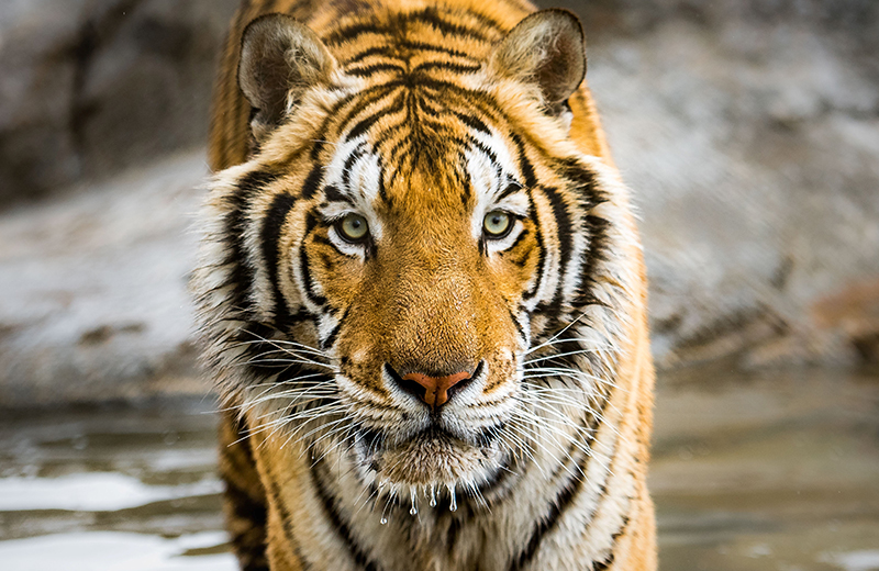However, Maverick didn't always have an affinity for water. In fact, he was one of the only tigers Bobbi had ever come across in her 25 years of experience that was afraid of water! When Maverick was first introduced into Tiger Trails, with its mighty waterfall and crystal-clear plunge pool, he was actually afraid. It took several introductions in the habitat before he would even get close to the water's edge. Finally, one hot summer day, after weeks of coaxing, Maverick dipped his paws into the cool pool for the first time and realizing how refreshing it was—he made the plunge. After that day, Maverick's hesitation was no more, and he splashed and swam to his heart's content.